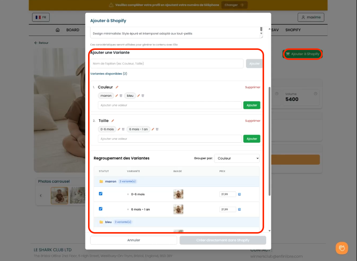Si tu souhaites ajouter des variantes à un produit en utilisant le bouton magique, une fois que tu as cliqué sur “Ajouter à Shopify”, tu verras apparaître une option "Ajouter une Variante"permettant d’ajouter des variantes.