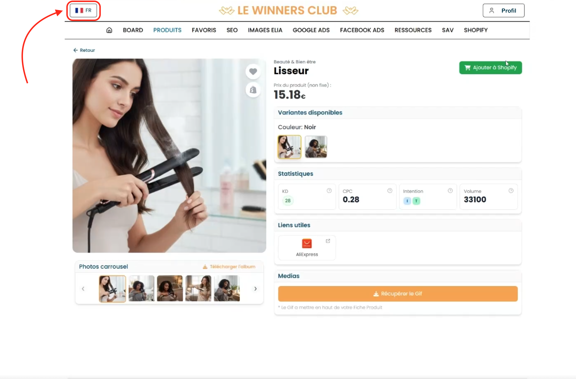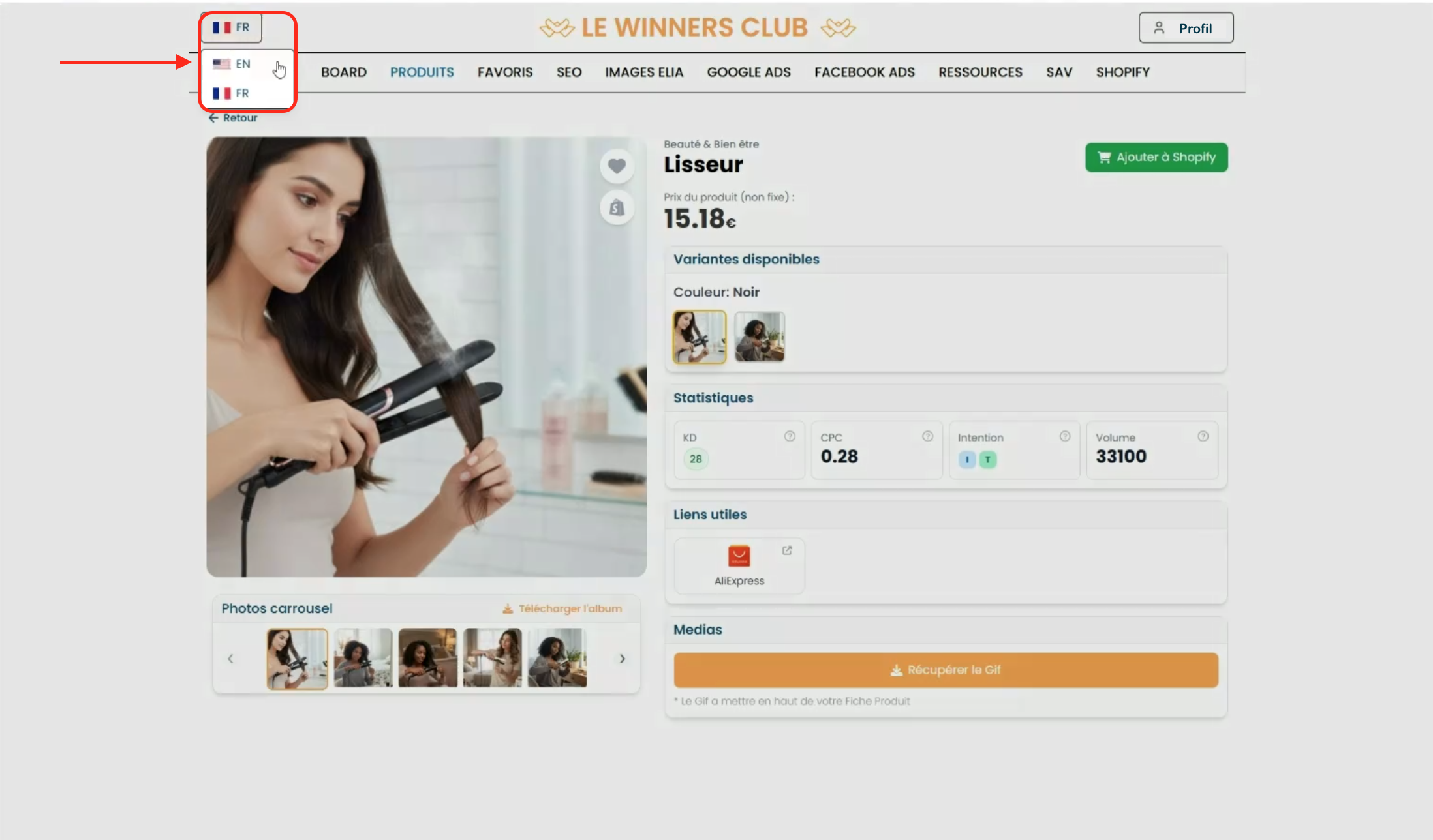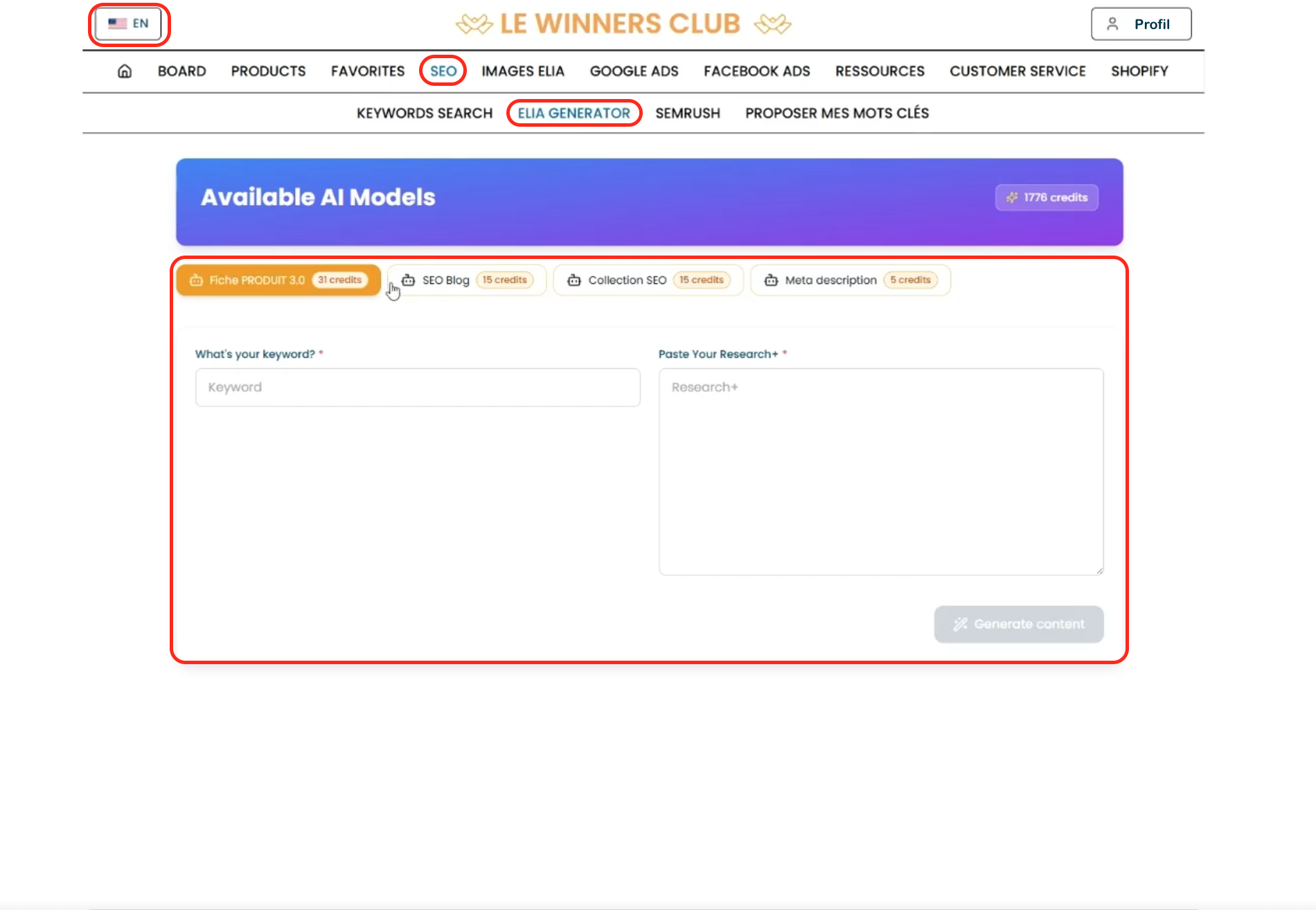 Une fois la langue anglaise sélectionnée, tout le contenu du Winners Club sera automatiquement traduit en anglais. Il en sera de même lorsque vous souhaiterez générer du contenu avec ELIA.