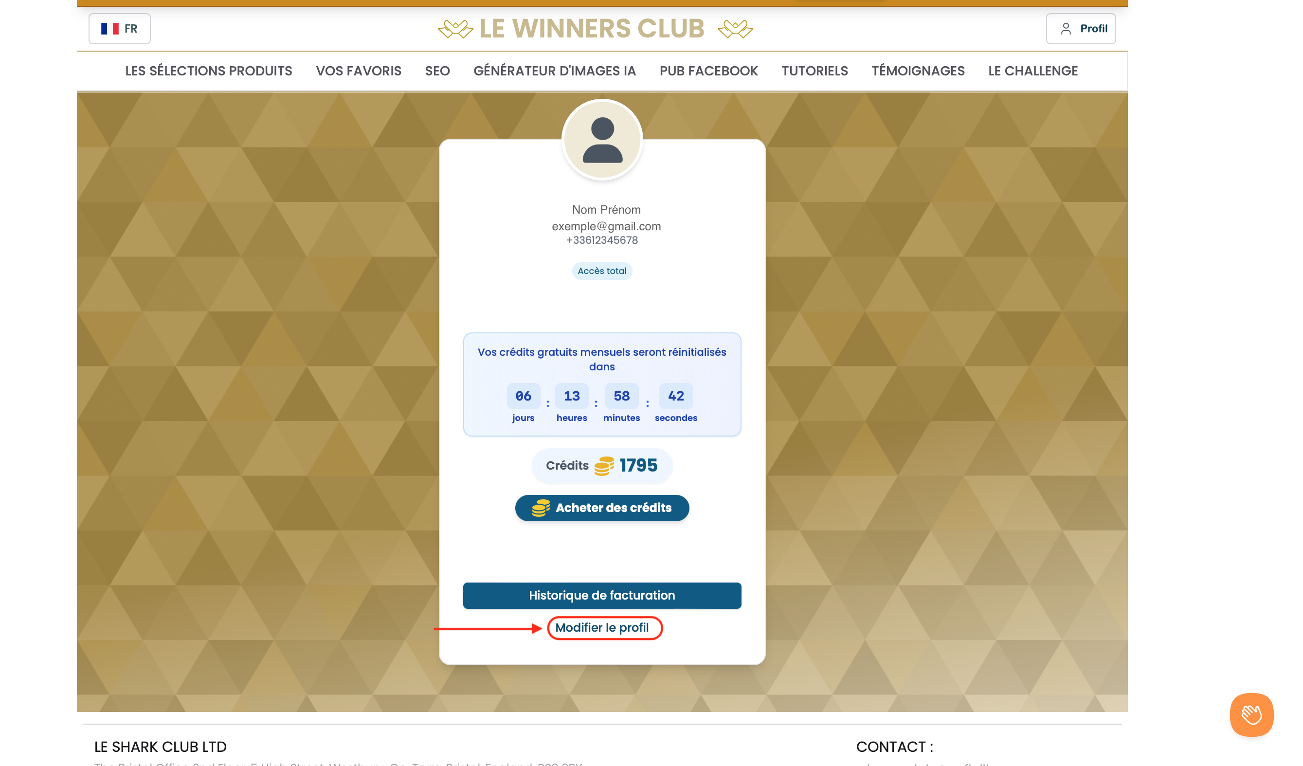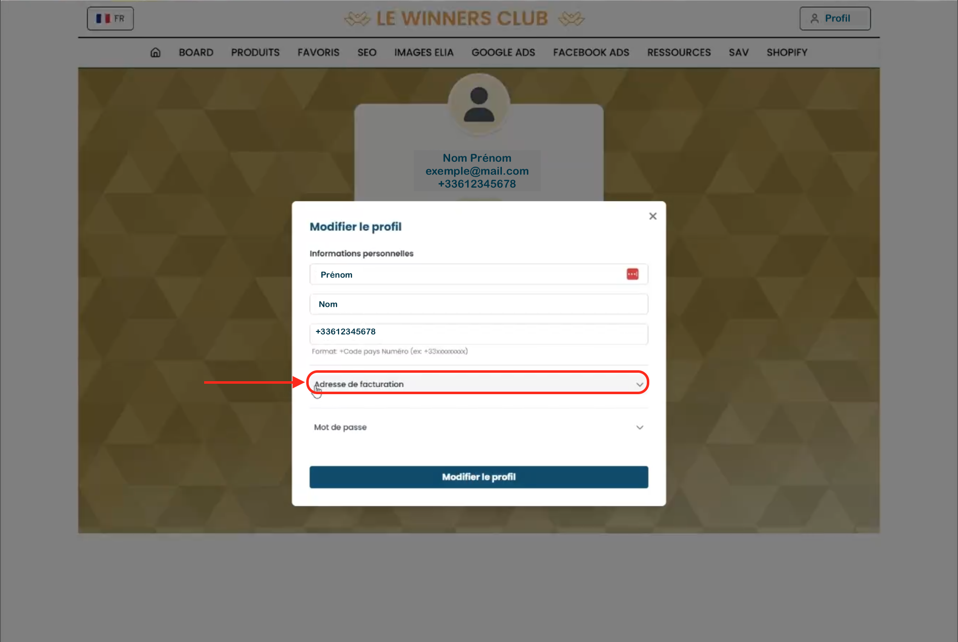 2) Une foi sur votre profil Winners Club, cliquez sur "Modifier le profil" :